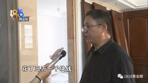 陳老師:“這個(gè)門送過來,發(fā)掘問題了,就這個(gè)門整個(gè)開裂的,門上面裂開以下裂開,都有問題的,門的邊框板油漆整個(gè)起泡的,護(hù)墻就是爛的,用爛板做的,(原本)理應(yīng)是高質(zhì)木門高質(zhì)材質(zhì) 。”