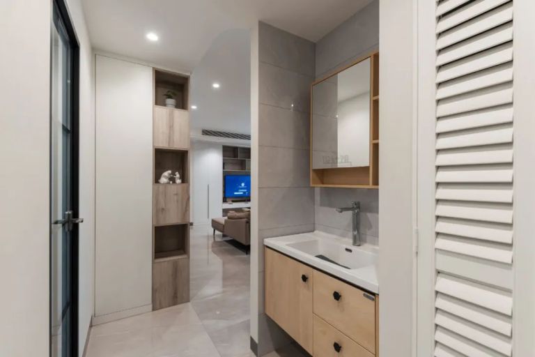 把衛(wèi)生間的洗手臺(tái)外置到過(guò)道區(qū)域,是一個(gè)很有智慧的設(shè)計(jì),可以大幅提升衛(wèi)浴使用效率!如果你家的面積不大,只有一個(gè)衛(wèi)生間且居住人口較多,那么就強(qiáng)烈推薦把洗手盆外置到過(guò)道上!這樣設(shè)計(jì)的話(huà),早上大家急著出門(mén)時(shí),有人上廁所,其他人也不用干等著,可以現(xiàn)在洗手臺(tái)刷牙洗臉。