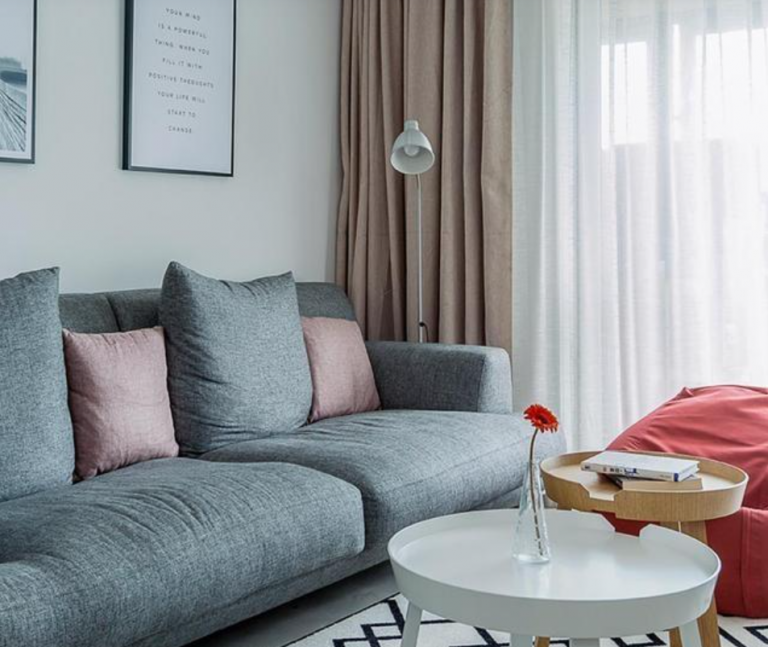 搭配了灰色沙發,坐著很舒服。中間布置茶幾為圓形組合式,一個白色一個原木色,而且加上了地毯,增加了視覺感,更顯得有檔次。家里如果需要地毯的話,還是很值得擁有的!