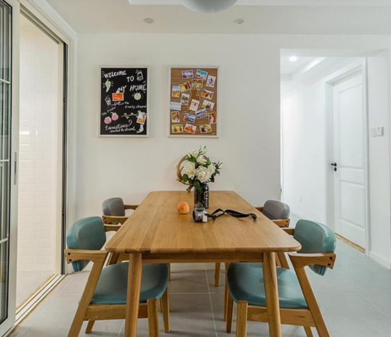 餐廳布置了一張原木方形餐桌,餐椅搭配了藍色的坐墊,坐著特別舒服,搭配起來不會讓人覺得單調,特別耐看。旁邊移動門進去就是廚房了,煮好的飯菜可以很快端出來,方便用餐。其實,不管是橫豎擺放,都沒有任何影響。一家人開開心心坐在一起用餐,很幸福!包括墻面安裝的吊燈,墻上懸著的裝飾畫,可以起到很好的裝飾效果,顯得很溫馨呢!