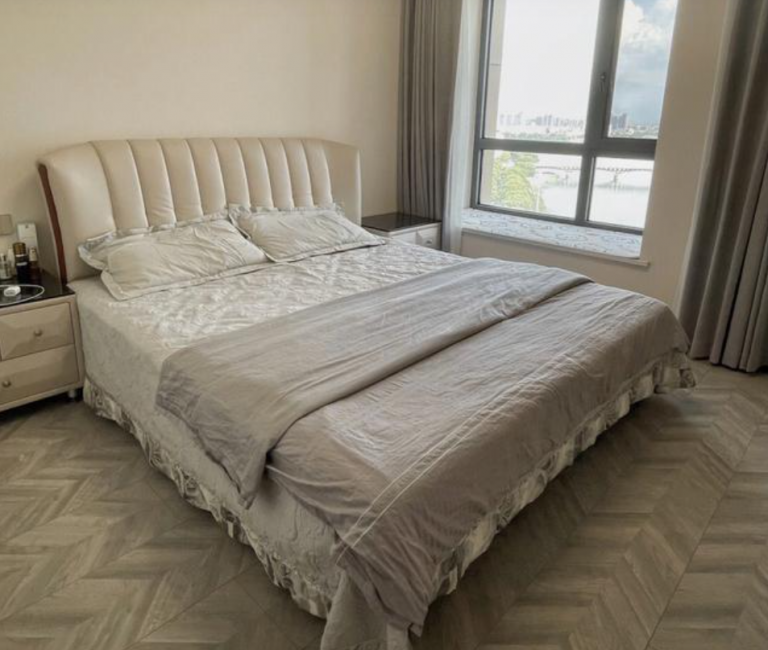 主臥空間還是比較寬敞的,而且床的款式也比較讓人喜歡,搭配的床上用品,看著簡單,但是很精致呀。飄窗沒辦法打掉,可以當小沙發使用,坐著玩手機,也覺得很舒服呢。全屋安裝了中央空調,頂面吊頂是不可缺少的一部分。