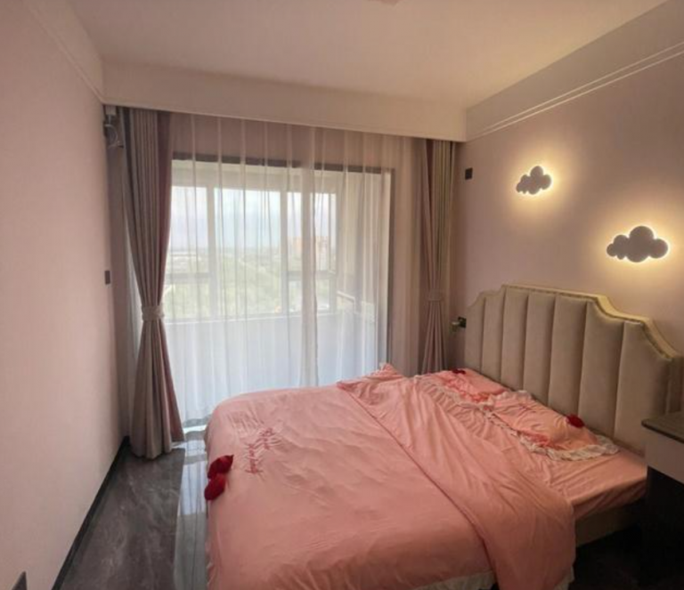 臥室空間不大,一張床加上床頭柜和衣柜基本沒(méi)有什么多余的空間了。床頭墻上安裝了網(wǎng)紅款的云朵壁燈,顏值非常高,可以起到很好的裝飾效果!頂面是沒(méi)有安裝吊頂,僅僅走了一圈石膏線(xiàn)條,看起來(lái)很有空間感。窗戶(hù)的位置設(shè)計(jì)了窗簾盒,顯得比較美觀,細(xì)節(jié)處理真心不錯(cuò)!