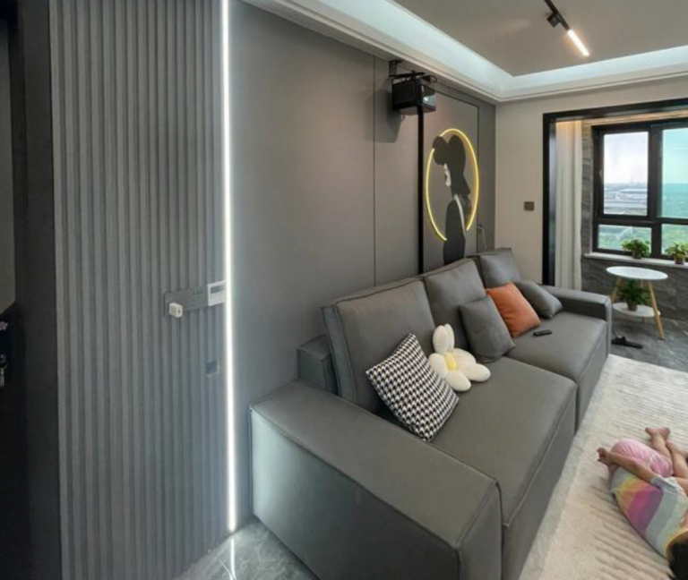 做了簡(jiǎn)單的電視背景墻,設(shè)計(jì)了格柵,效果還是蠻不錯(cuò)的。而且還加了線(xiàn)條燈裝飾,可以起到很好的氛圍效果,看著都很有檔次。而且還安裝了投影儀,以后可以方便使用。感受家庭影院的感覺(jué)!