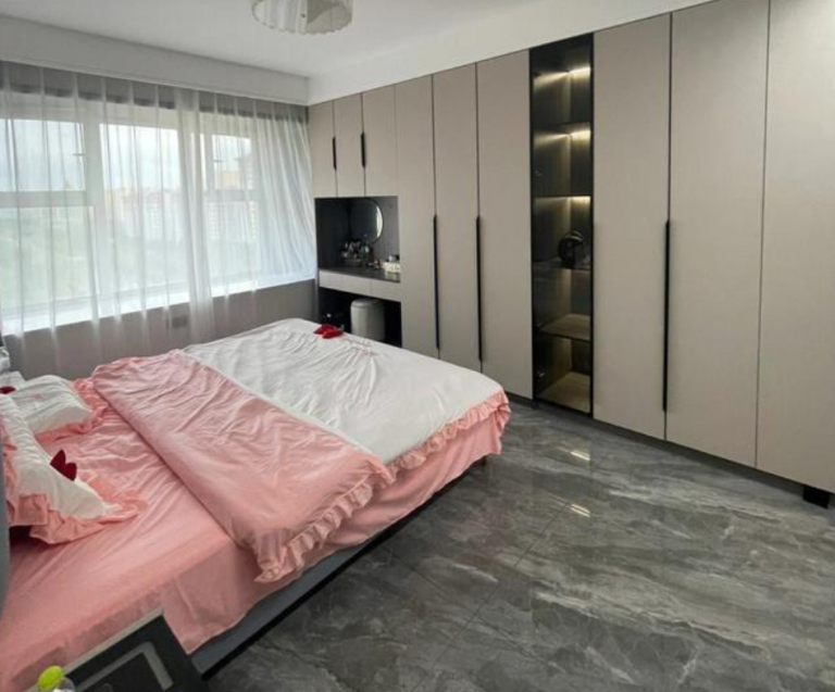這是主臥,床尾對(duì)面的墻體設(shè)計(jì)的衣柜直接到頂,半點(diǎn)空間都沒(méi)有浪費(fèi)。設(shè)計(jì)柜子的時(shí)候,旁邊預(yù)留了梳妝臺(tái)的位置,可以非常方便女屋主使用,大小位置合適。全屋地面選擇選擇鋪貼灰塵瓷磚,非常耐臟。