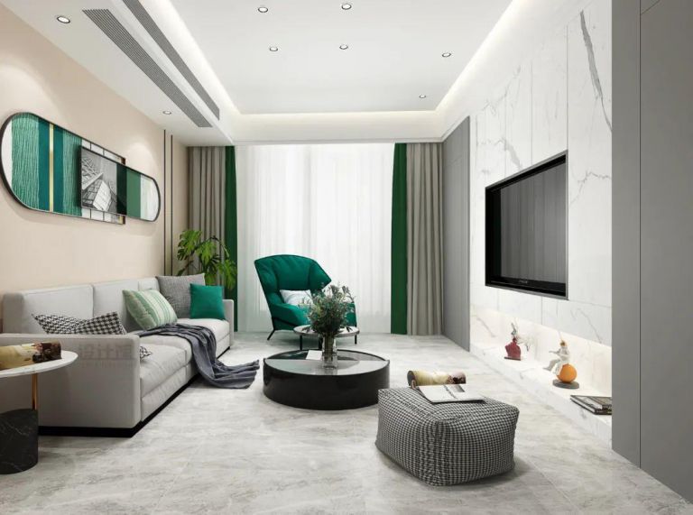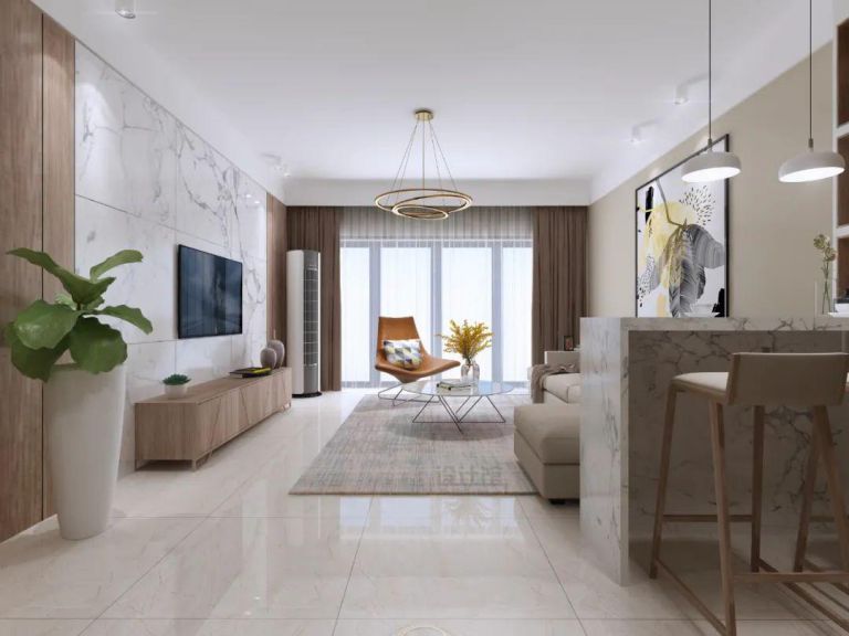 在比較現代風的空間中,也可以在電視墻加入大理石的背景墻設計,同時在兩側加入對稱的木飾面材質,也可以增加空間的自然舒適,避免大理石質感帶來的單一冰冷感受。