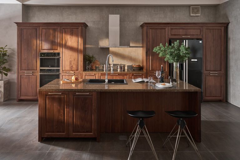 深色木紋的天然實木廚柜適用于明亮的廚房。無論風格是現代還是經典,深色木質廚房都是永恒的選擇,將為您的廚房帶來一定的優雅。深色廚柜看起來時尚、神秘和高檔。