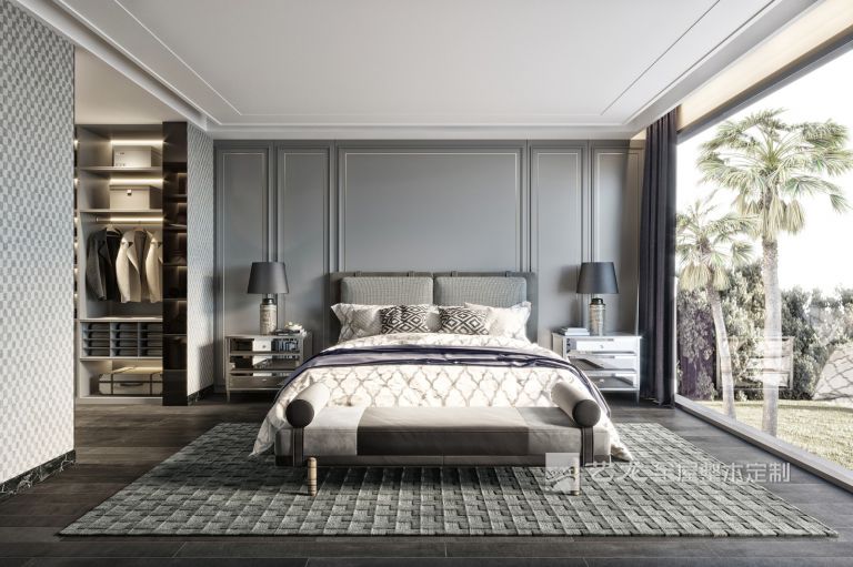 臥室的整個(gè)墻面是淺灰色,床品、軟裝也是灰白色的,搭配淺灰色的衣柜、床頭柜等家具,整個(gè)臥室看起來非常輕松和舒服。
